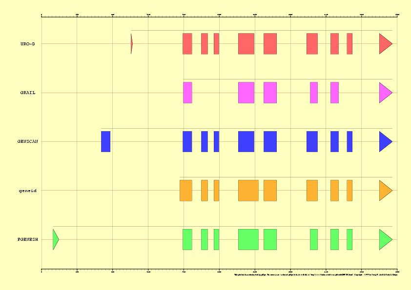 - NOTE: First exon is always missed in the predictions and there are some problems to detect the donor site from exon 5. Detection of Start codons is a serious drawback in current gene finding programs (see Figure 2). However, this problem can be overcome by using homology information to complete the gene prediction.